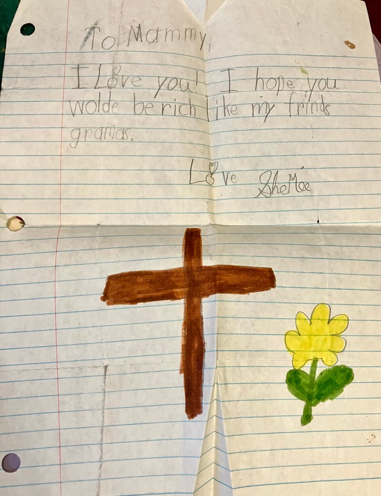 Oh my goodness Mammy, if I only knew then as a little girl how rich you were and would be! Now you have all the treasures of Heaven and are walking on the streets of gold in Glory! I know there is now no more pain and tears. The pain we feel here is nothing to the joy you are now experiencing with Jesus.
