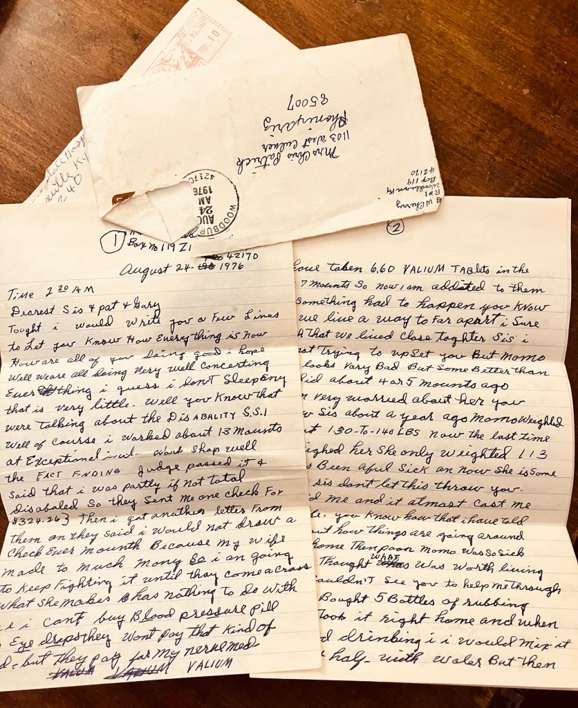 Thought I would write you a few lines to let you know how everything is now. How are all of you doing? Good I hope. Well, we are all doing very well concerting ever-thing. I guess I don’t sleep any, that is very little. Well, you know that were talking about the DISABILITY SSI. Well, of course I worked about 13 months at Exceptional Ind. work shop, well, the fact finding judge passed it & said that I was partly if not total disabled so they sent me one check for $324.26. Then I get another letter from them an they said I would not draw a check ever month because my wife made to much money so I am going to keep fighting it until they come across what she makes has nothing to do with me. I can’t buy blood pressure pills or eye drops, they won’t pay for that kind of med, but they pay for my nerve med- VALIUM. I have taken 6.60 VALIUM tablets in the last 7 months, so now I am addicted to them. But something had to happen, you know. Sis, we live a way too far apart. I sure wish that we lived close together. Sis, I am not trying to upset you, but Moma sure looks very bad, but some better than she did about 4-5 months ago. I am very worried about her you know, Sis, about a year ago Moma weighed about 130 to 140 lbs, now the last time I weighed her she only weighed 113. She has been awful sick an now she is some better. Sis, don’t let this throw you, it did me and it almost cost me my life. You know how that I have told you about how things are going around here at home, then poor Moma was so sick I just thought WHAT was worth living for I couldn’t see you to help me through it so I bought 5 bottles of rubbing alcohol, took it right home and when I started drinking it I would mix it half & half with water, but then the last I knew I was drinking it straight from THE BOTTLE so that was the last I knew for about 3 days, when I came to I was in intensive care. I stayed in there 3 days and nights- BUT GOD was with me ever step of the way I know and that Dr. said one more would be the end. Of course I have not drank that much but I get so lonesome I could cry HANK WILLIAMS HA.